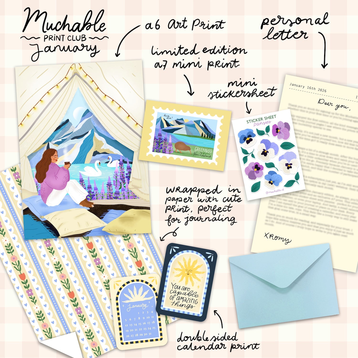 A little bit of mail happiness on your doorstep every month! With the Print Mail Club You'll receive a lovingly crafted art print and an exclusive mini print. A little moment of joy for yourself, or a sweet gift to surprise someone.